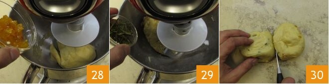 Schließlich die kandierten Mandarinen 28 und die kandierten Rosmarinnadeln hinzufügen, ein paar für die endgültige Dekoration beiseite lassen 29. Wenn sie in den Teig eingearbeitet sind, die Küchenmaschine stoppen und den Teig auf eine Arbeitsfläche übertragen. Aus dem gesamten Teig 4 Stücke à ca. 120 g formen 30.