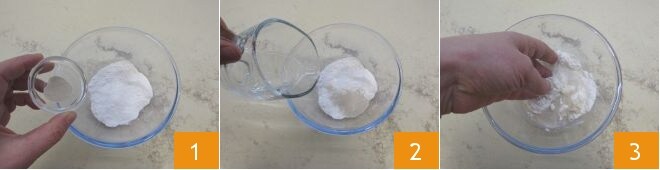Um die kleinen Panettone mit kandierten Mandarinen und Rosmarin zuzubereiten, beginnen Sie mit dem Vorteig: In einer kleinen Schüssel das gesiebte Mehl und die Trockenhefe 1 geben, dann das Wasser bei Raumtemperatur hinzufügen 2 und von Hand zu kneten beginnen 3