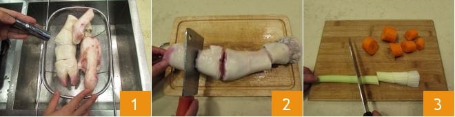 Um den Nervettensalat zuzubereiten, beginnen Sie damit, die Kalbsfüßchen, auch die Knie, falls vorhanden, gründlich unter fließendem Wasser zu waschen 1. Danach teilen Sie die Füßchen mit einem Fleischerbeil in Stücke 2, dann schneiden Sie auch Sellerie und Karotte, nachdem Sie sie geputzt haben 3.