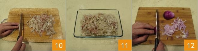 und schneiden Sie die Nervetti in dünne Streifen 10, sammeln Sie sie in einem Glasbehälter und lassen Sie sie eine Stunde abkühlen 11. Schneiden Sie die Zwiebel in dünne Scheiben, nachdem sie geputzt und vom inneren Kern, also dem Mittelteil, befreit wurde 12