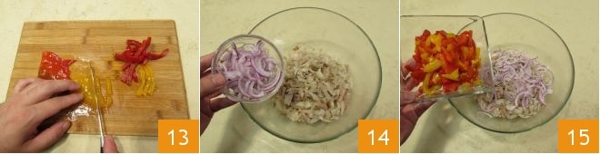 und dann schneiden Sie auch die eingelegten Paprika in Streifen 13. An diesem Punkt nehmen Sie die Nervetti und fügen sie den Zwiebeln 14 und den Paprika hinzu 15.