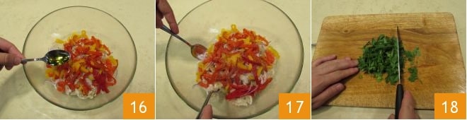 Geben Sie etwas Öl, Salz und schwarzen Pfeffer hinzu 16 und vermischen Sie alles gut 17. Hacken Sie die Petersilie 18, die zuvor gewaschen und getrocknet wurde,