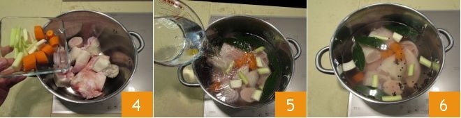 In einem großen Topf geben Sie das Fleisch und das Gemüse 4, fügen dann das Lorbeerblatt hinzu und bedecken alles mit viel Wasser 5. Schließlich geben Sie das Salz, die schwarzen Pfefferkörner und den Weißweinessig hinzu 6 und bringen alles zum Kochen, indem Sie einen Deckel auflegen.