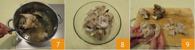Kochen Sie auf niedriger Flamme etwa zweieinhalb Stunden, wobei der Deckel stets auf dem Topf bleibt, und gießen Sie am Ende der Garzeit die Teile ab 7, lassen Sie sie in einem Behälter abkühlen 8. Entfernen Sie das Fleisch von den Knochen mit den Händen 9