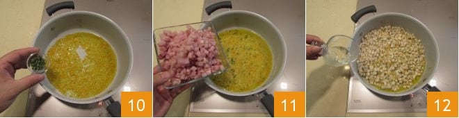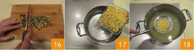Sobald sie gebräunt sind, geben Sie sie auf ein Schneidebrett und zerkleinern Sie sie, indem Sie sie mit der Messerspitze hacken 16. Kochen Sie die Gnocchetti in reichlich kochendem und gesalzenem Wasser 17 und sobald sie al dente sind, gießen Sie sie ab 18.