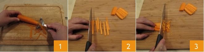 Um die Gnocchetti Sardi mit Schwertfisch und Pistazien zuzubereiten, beginnen Sie mit dem Putzen des Gemüses. Waschen Sie die Karotten, entfernen Sie die beiden Enden und schälen Sie sie 1, schneiden Sie sie dann in Hälften und anschließend in Stifte 2, um sie schließlich in etwa 0,5 cm große Würfel zu schneiden 3.