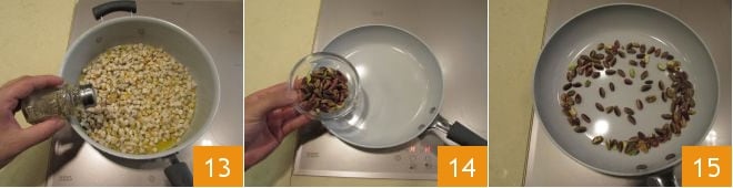 Sobald der Alkohol vollständig verdampft ist, können Sie mit Salz und Pfeffer abschmecken 13. In einer Pfanne geben Sie die Pistazien 14 und rösten sie ein paar Minuten bei starker Hitze, achten Sie darauf, dass sie nicht anbrennen, da sie sonst bitter werden könnten. Rühren Sie also häufig um 15.