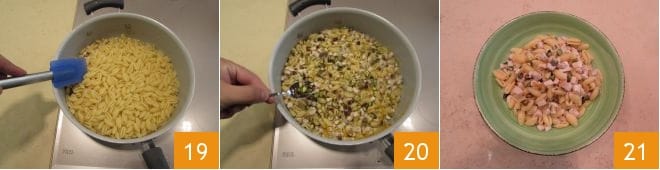 Geben Sie die Pasta in den Topf mit der Sauce, auf diese Weise nehmen sie den Geschmack der Soße auf 19, rühren Sie um und fügen Sie die gerösteten Pistazien hinzu 20. Die Gnocchetti Sardi mit Schwertfisch und Pistazien sind fertig, Sie müssen sie nur noch auf die Teller geben und heiß genießen 21!