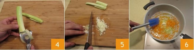 Machen Sie dasselbe mit dem Selleriestängel, entfernen Sie jedoch vorher die faserige Außenhaut, indem Sie sich mit einem Sparschäler behelfen 4. Schneiden Sie auch diesen in Würfel 5. In einem Topf geben Sie das Öl zusammen mit den sehr kleinen Karotten- und Selleriewürfeln und fügen auch die geschälte Knoblauchzehe hinzu. Lassen Sie alles bei hoher Hitze 7-8 Minuten kochen und rühren Sie gelegentlich um, damit das Gemüse nicht anbrennt oder am Boden festklebt 6.