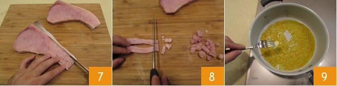 In dieser Zeit entfernen Sie die Haut von den Schwertfischscheiben 7 und fahren dann mit dem Schneiden fort: Für einen fantasievolleren Touch können Sie den Schwertfisch sowohl in grobe als auch in etwa 3-4 mm dicke Würfel schneiden 8. Entfernen Sie die Knoblauchzehe aus dem Bratenansatz 9