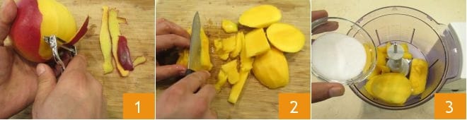 Um die Mango-Limetten-Eis am Stiel zuzubereiten, fangt mit der Mango an: Schälen Sie sie mit einem Sparschäler 1 und schneiden Sie dann das Fruchtfleisch um den Kern herum ab 2; Sie benötigen 400 g Fruchtfleisch für das Rezept. Geben Sie das Mangofleisch in den Mixer und fügen Sie den Zucker hinzu 3.