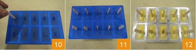 Setzen Sie nun den Deckel auf die Form und stecken Sie einen Holzstiel für Eis am Stiel in das dafür vorgesehene Loch 10, sodass jedes Eis am Stiel seinen eigenen Stiel hat 11. Stellen Sie die Form für mindestens 3 Stunden in den Gefrierschrank. Wenn die Eis am Stiel vollständig gefroren sind, entfernen Sie die Abdeckung 12: Die Stiele sollten fest im Eis stecken bleiben.
