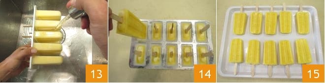 Sie können die Form für einen kurzen Moment unter fließendes Wasser halten, achten Sie darauf, die Eis am Stiel nicht nass zu machen 13: Dies hilft Ihnen, die Eis am Stiel leichter aus der Form zu lösen. Ziehen Sie die Eis am Stiel vorsichtig aus jeder Form, achten Sie darauf, sie nicht zu zerbrechen 14, und servieren Sie sie sofort 15. Ihre Mango-Limetten-Eis am Stiel sind bereit zum Genießen!