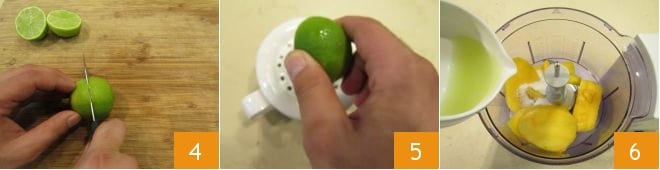 Schneiden Sie die Limetten in zwei Hälften 4 und pressen Sie sie mit einer Zitruspresse aus 5. Gießen Sie den kernlosen Saft in den Mixer, zusammen mit dem Mango und dem Zucker 6.