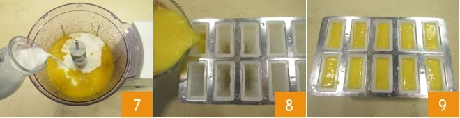 Mischen Sie gut und sobald die Mango zu einem Püree verarbeitet ist, fügen Sie die Mandelmilch hinzu 7. Mixen Sie erneut, um alle Zutaten gut zu vermengen, und gießen Sie dann die Mischung in die Eisformen, die jeweils 70 ml fassen 8. Verteilen Sie die Mischung in jede Form und achten Sie darauf, 1-2 Millimeter vom inneren Rand der Form frei zu lassen 9.