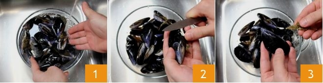 Um die Miesmuscheln nach Tarentiner Art zuzubereiten, kümmern Sie sich zunächst um die Wie man Miesmuscheln reinigt und öffnet. Spülen Sie die Miesmuscheln unter fließendem Wasser ab 1, und entfernen Sie dann mit der Rückseite eines kleinen Messers alle äußeren Verunreinigungen 2 und ziehen Sie den Bart mit einer entschlossenen Bewegung ab 3.
