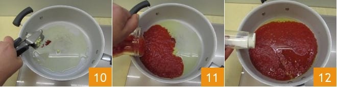 Geben Sie in einen anderen Topf den restlichen Teil des Öls, fügen Sie die Chilischote und die andere zerdrückte Knoblauchzehe hinzu 10, lassen Sie das Sautieren bei sehr schwacher Hitze goldgelb werden und rühren Sie gelegentlich um. Dann fügen Sie das Tomatenfruchtfleisch hinzu 11, würzen Sie mit einer Prise Pfeffer und einer Prise Salz (nur eine Prise, da die Miesmuscheln bereits sehr würzig sind), achten Sie darauf, nicht zu übertreiben, da die Miesmuscheln bereits sehr würzig sind 12. Lassen Sie das Sößchen 5-6 Minuten kochen und rühren Sie es gelegentlich um.