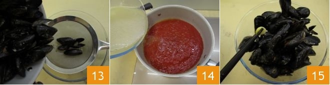 Filtern Sie die Miesmuscheln, indem Sie die Brühe in einer kleinen Schüssel auffangen 13, so dass Sie sie leichter zu dem Sößchen geben können 14. Lassen Sie sie weitere 10 Minuten kochen; in der Zwischenzeit entfernen Sie den Knoblauch 15 und die Petersilie von den Miesmuscheln und stellen Sie sie beiseite.