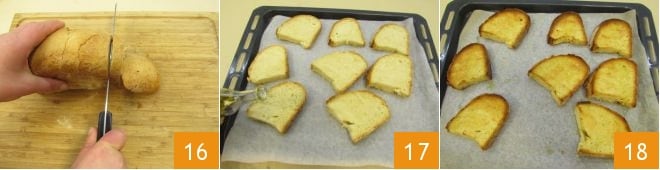 Es fehlt nur noch die knusprige Beilage: Schneiden Sie das apulische Brot in Scheiben 16, legen Sie es auf ein mit Backpapier ausgelegtes Backblech und beträufeln Sie es mit einem Schuss Öl 17, dann rösten Sie es wenige Minuten im Ofen unter dem Grill bei 250° für 3 Minuten, bis es gut goldbraun ist 18.