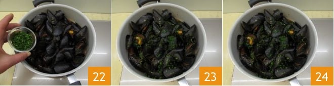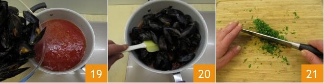 Sobald die Sauce fertig ist, fügen Sie die Miesmuscheln hinzu 19 und rühren Sie um 20. Dann hacken Sie die Petersilie fein 21