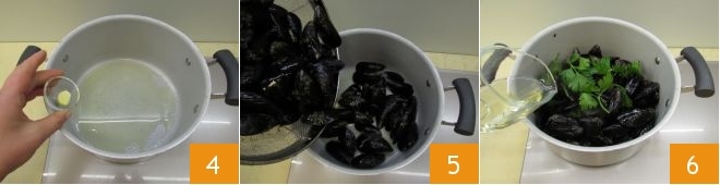 Geben Sie die Hälfte der angegebenen Ölmenge in einen Topf und fügen Sie eine geschälte, ganze Knoblauchzehe hinzu 4; lassen Sie sie goldgelb werden und geben Sie die Miesmuscheln dazu 5. Fügen Sie einen Bund ganzen Petersilie und den Weißwein zum Ablöschen hinzu 6,