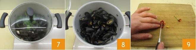 dann decken Sie mit einem Deckel ab 7 und lassen Sie die Miesmuscheln aufgehen 8: Es dauert etwa 4 Minuten, sobald sie sich öffnen, können Sie das Feuer ausschalten. In der Zwischenzeit entfernen Sie die Kerne der Chilischote und hacken sie fein 9.