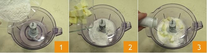 Um die Mini Ananas-Tatins zuzubereiten, beginnen Sie mit dem Mürbeteig: Geben Sie das Mehl 1, die kalte Butter aus dem Kühlschrank in Stückchen geschnitten 2 und eine Prise Salz 3 in einen Mixer.
