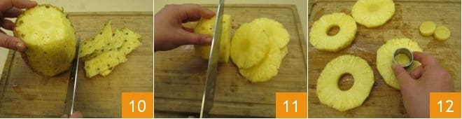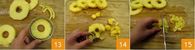 Nehmen Sie nun einen 10 Zentimeter großen Ausstecher und schneiden Sie 4 der 5 Ananasscheiben weiter aus 13, um 4 perfekt runde und gleiche Scheiben zu erhalten, und legen Sie sie beiseite. Nehmen Sie die andere Ananasscheibe und schneiden Sie mit dem 3 cm Ausstecher 4 kleine Kreise aus dem weicheren, fleischigen Teil der Scheibe 14. Schneiden Sie den Rest der Scheibe in Würfel von etwa einem halben Zentimeter 15.