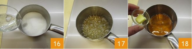Legen Sie die Ananas beiseite und machen Sie sich an die Zubereitung des Karamells: Geben Sie Zucker in einen Topf mit dickem Boden, fügen Sie dann das Wasser hinzu 16 und bringen Sie es zum Kochen 17. Lassen Sie es bei sehr kleiner Hitze köcheln, bis der Zucker eine schöne bernsteinfarbene Farbe angenommen hat. An diesem Punkt geben Sie die Butter bei Raumtemperatur hinzu 18