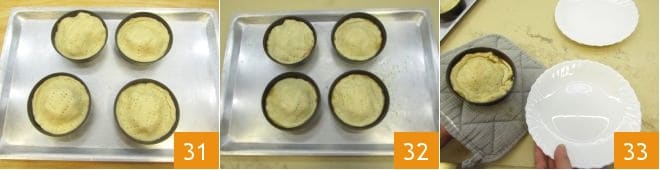 Decken Sie jede Form mit einer Mürbeteigscheibe ab 28 und drücken Sie die Ränder vorsichtig mit den Fingern fest 29. Stechen Sie die Oberfläche mit einer Gabel ein 30.