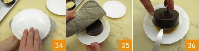 und legen Sie einen Teller darauf 34, drehen Sie die Form um 35 und lassen Sie die Tatins auf den Teller gleiten: falls nötig, lösen Sie die Tatins vorsichtig mit der Messerspitze 36.