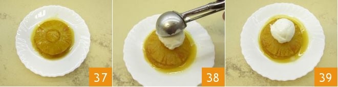 Lassen Sie den während des Backens entstandenen Sirup an den Rändern des Mürbeteigs herunterlaufen 37 und verteilen Sie dann eine Kugel Vanilleeis auf die Ananasscheibe 38. Servieren Sie sie sofort, noch warm 39. Ihre Mini Ananas-Tatins sind bereit, genossen zu werden!