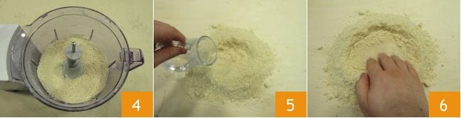 Mixen Sie alles, bis Sie eine sandige und mehlige Konsistenz erhalten 4. Geben Sie die Mischung dann auf eine Marmor-, Metall- oder Glasoberfläche (sie sollte kalt sein) und formen Sie die klassische Brunnenform. Fügen Sie nach und nach das kalte Wasser hinzu 5 und kneten Sie schnell. Kneten Sie mit den Fingern weiter 6, um den Teig so wenig wie möglich zu erwärmen.