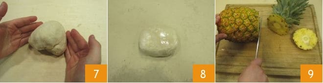 Verarbeiten Sie den Teig schnell, bis er kompakt, fest und elastisch genug ist 7. Sobald er fertig ist, wickeln Sie den Mürbeteig in Frischhaltefolie 8 und lassen Sie ihn für mindestens 40 Minuten im Kühlschrank ruhen. In dieser Zeit können Sie sich um die Ananas kümmern: Entfernen Sie beide Enden 9