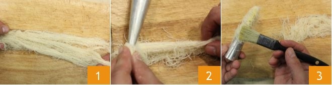 Um die Mini-Croissants mit Lachs und Stracchino zuzubereiten, zerteilen Sie den Kataifi-Teig und erstellen Sie eine Art Band 1, dann nehmen Sie Stahlkegel und bestreichen diese mit Butter, wickeln Sie den Streifen Blätterteig um den Kegel, beginnend mit der spitzen Seite des Kegels 2 und fortfahrend zur breiteren Seite hin 3,