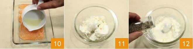 Dann beträufeln Sie mit Zitronensaft 10, bedecken Sie mit Folie und bewahren Sie den marinierten Lachs im Kühlschrank auf. In der Zwischenzeit bereiten Sie die Creme zu: geben Sie den Stracchino in einen Mixer mit Klingen 11, würzen Sie mit Salz, Pfeffer 12,