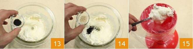 pürieren Sie, um ihn cremig zu machen, dann fügen Sie schwarze 13 und weiße 14 Sesamsamen hinzu und verrühren Sie, um Geschmack zu verleihen. Übertragen Sie die erhaltene Creme in einen Spritzbeutel mit Sterntülle 15