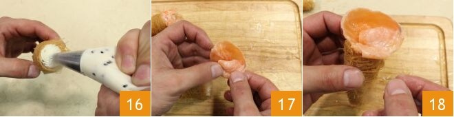 drücken Sie einen Klecks Creme in jedes Mini-Croissant 16, nehmen Sie die Lachsscheiben und rollen Sie sie zu Blütenblättern 17, legen Sie ein Blütenblatt auf jedes Croissant 18,