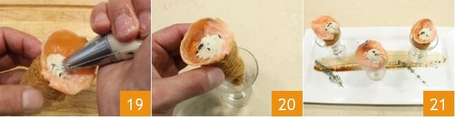 drücken Sie dann einen weiteren Klecks Creme in die Mitte, um es zu versiegeln 19. Transferieren Sie die Croissants in schmale Gläser, Likörgläser eignen sich gut 20 und servieren Sie dann Ihre Mini-Croissants mit Lachs und Stracchino auf einer Servierplatte, garniert mit frischen Thymianzweigen 21.