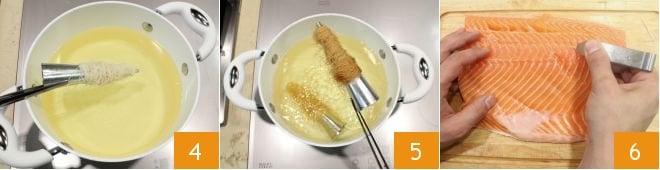 bestreichen Sie den Teig mit dem verquirlten Ei 4. Frittieren Sie in heißem Pflanzenöl bei 170 °C (für eine optimale Zubereitung verwenden Sie ein Lebensmittelthermometer) bis zur goldbraunen Färbung (dies dauert etwa 3 Minuten), dann heben Sie die Croissants mit einer Küchenzange heraus 5 und legen Sie sie zum Abtropfen auf ein mit Küchenpapier ausgelegtes Tablett. Kümmern Sie sich um den Lachs, wenn Sie sicher sind, norwegischen Lachs gekauft zu haben, wären keine weiteren Vorsichtsmaßnahmen nötig. Andernfalls stellen Sie sicher, dass Sie schockgefrosteten Fisch gekauft haben und frieren Sie ihn mindestens 96 Stunden bei -18 Grad ein, bevor Sie ihn im Rezept verwenden: entfernen Sie die Gräten mit einer speziellen Zange 6