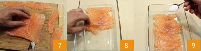 schneiden Sie aus dem Filet 8 Scheiben, indem Sie diagonal schneiden 7, legen Sie die Scheiben in eine breite Auflaufform, ohne sie zu überlappen 8 und streuen Sie Salz und Zucker über die Oberfläche 9