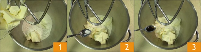 Um den Mürbeteig ohne Eier zuzubereiten, geben Sie Mehl und kalte Butter aus dem Kühlschrank in die Schüssel einer Küchenmaschine mit Flachrührer 2, fügen Sie das Salz 2 und den Vanilleextrakt 3 hinzu und verarbeiten Sie es 3 Minuten lang.