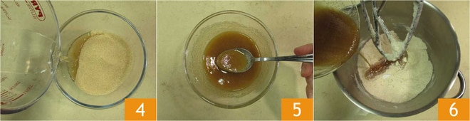 In der Zwischenzeit geben Sie den braunen Zucker und das Wasser bei Raumtemperatur in eine separate Schüssel 4 und rühren Sie gut um 5. Fügen Sie die Wasser-Zucker-Mischung zum Teig hinzu 6 und starten Sie die Küchenmaschine erneut.