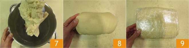 Sie sollten einen glatten, homogenen und kompakten Teig erhalten 7. An diesem Punkt den Teig auf die Arbeitsfläche legen, einen Laib formen 8, mit Frischhaltefolie abdecken 9 und mindestens 30 Minuten im Kühlschrank ruhen lassen, bevor Sie ihn verwenden. Ihr Mürbeteig ohne Eier ist fertig!