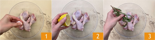 Um das Ofenhuhn mit Kartoffeln und Zwiebeln zuzubereiten, legen Sie das Huhn in eine große Schüssel und fügen Sie das Salz 1, den Zitronensaft 2 und den Rosmarinzweig 3 hinzu. Mischen Sie und lassen Sie das Huhn etwa 20 Minuten lang ziehen.