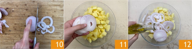 Schälen und schneiden Sie die Zwiebeln in einem halben Zentimeter dicken Scheiben 10, dann geben Sie sie in die Schüssel mit den Kartoffeln 11 und würzen Sie mit Öl 12.