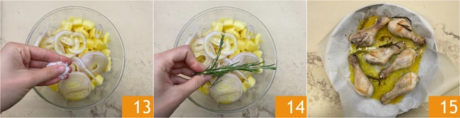 Würzen Sie mit Salz 13 und Rosmarin 14. Nehmen Sie das Huhn nach 40 Minuten Garzeit aus dem Ofen 15.