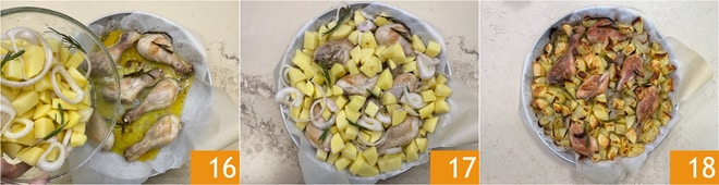 Fügen Sie auch die Kartoffeln und Zwiebeln hinzu 16. Setzen Sie die Garzeit weiterhin im statischen Ofen auf der mittleren Schiene bei 220° für weitere 40 Minuten fort 17. Nehmen Sie das Ofenhuhn mit Kartoffeln und Zwiebeln aus dem Ofen und lassen Sie es vor dem Servieren etwas abkühlen 18.