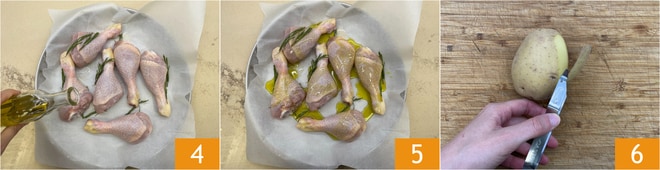 Übertragen Sie das Huhn in eine mit Backpapier ausgelegte Auflaufform, beträufeln Sie es mit extra nativem Olivenöl 4 5 und backen Sie es im vorgeheizten statischen Ofen bei 220° auf der mittleren Schiene für 40 Minuten. In der Zwischenzeit schälen Sie die Kartoffeln 6.