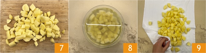 Schneiden Sie sie in Stücke 7. Legen Sie die Kartoffeln für 30 Minuten in eine Schüssel mit Wasser 8, um die überschüssige Stärke zu entfernen. Abtropfen lassen und die Kartoffeln trocknen 9.